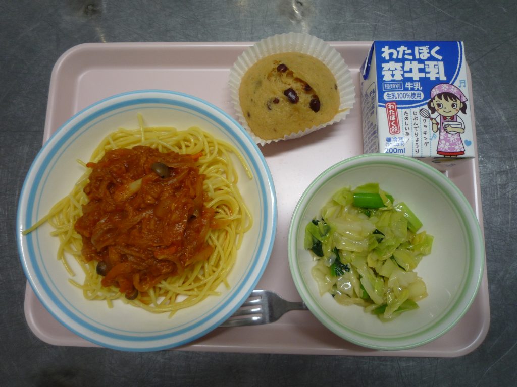 スパゲティアラビアータ・グリーンサラダ・あずきカップケーキ・ぎゅうにゅう