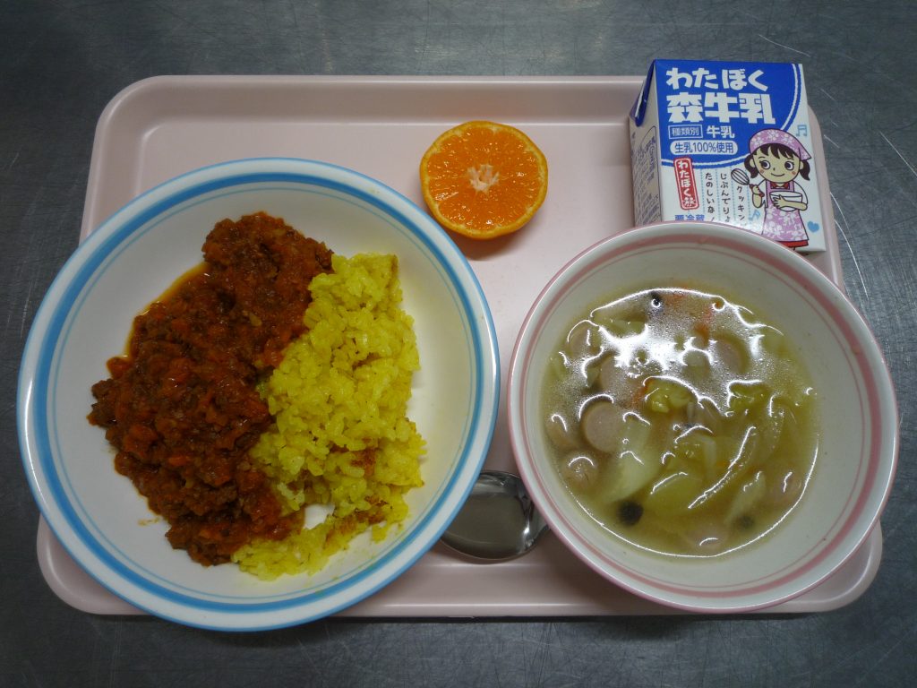 トキハソースのミートライス・やさいスープ・きっかみかん・ぎゅうにゅう