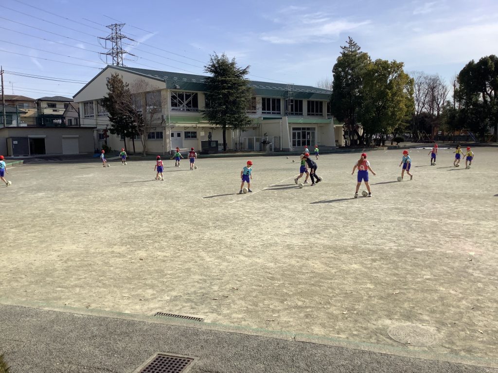2年生からの「ボール蹴りゲーム」から、ゴールを使わない「ラインサッカー」になりました。高学年になるとさらにゴールがある「サッカー」に発展していきます。