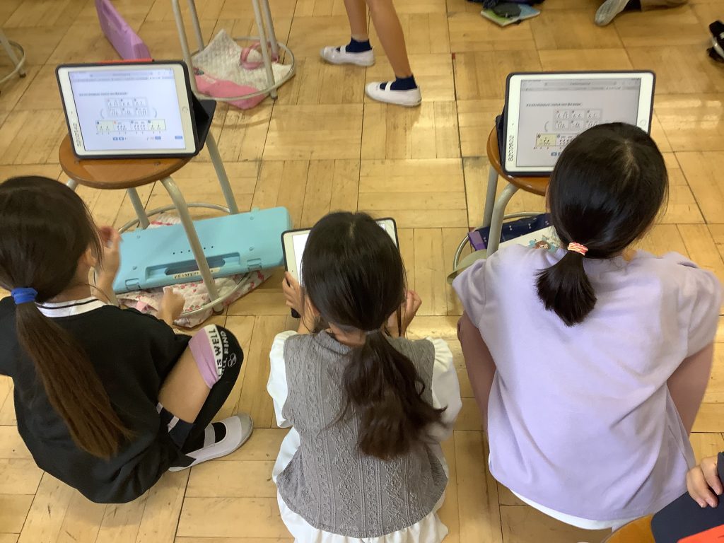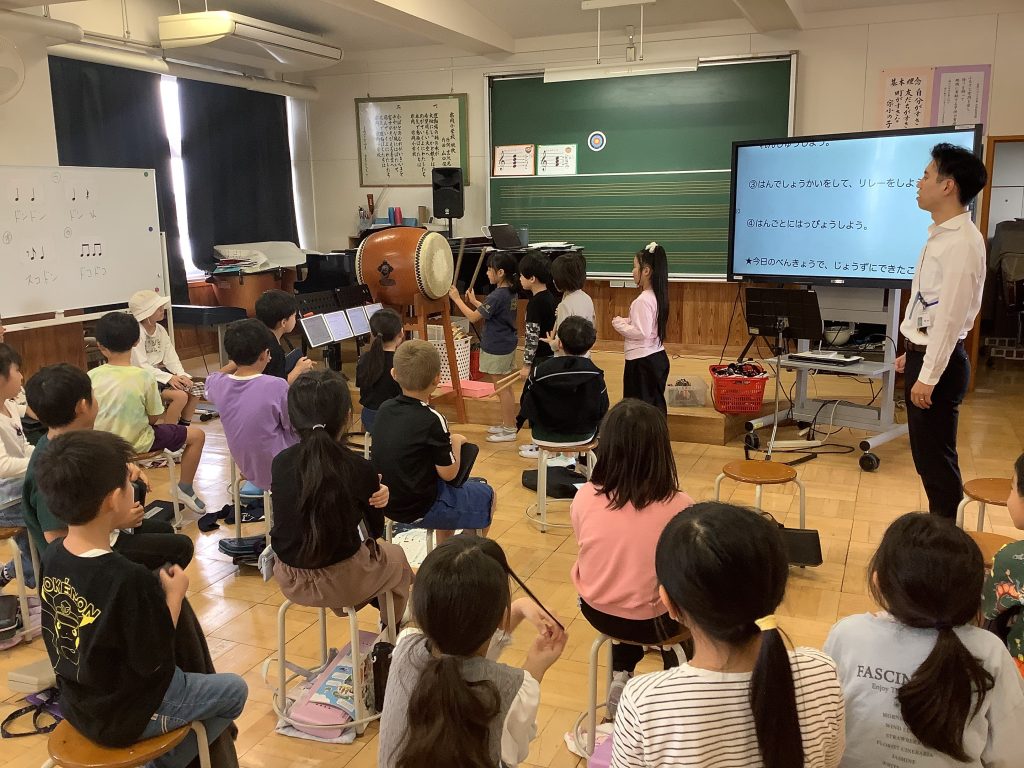 2年生、音楽の授業の様子です。「おまつりの音楽」という教材に取り組んでいます。ここでは、繰り返しのリズムを使って、音楽をつくることをねらいとしています。