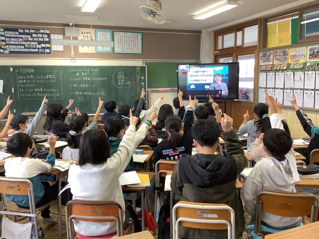 5年生、社会の授業の様子です。「自動車をつくる工業」の学習を行っています。今日は、自動車工場オンライン見学として、神奈川県横須賀市にある日産の追浜(おっぱま)工場とオンラインで結び、自動車工場を見学しています。