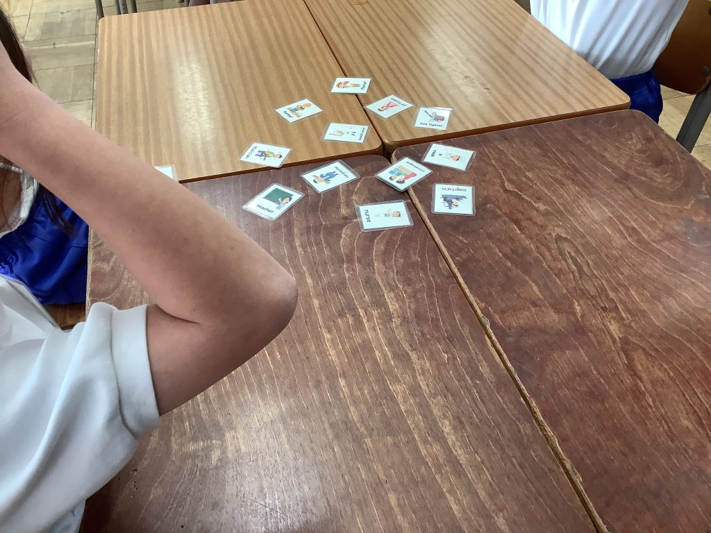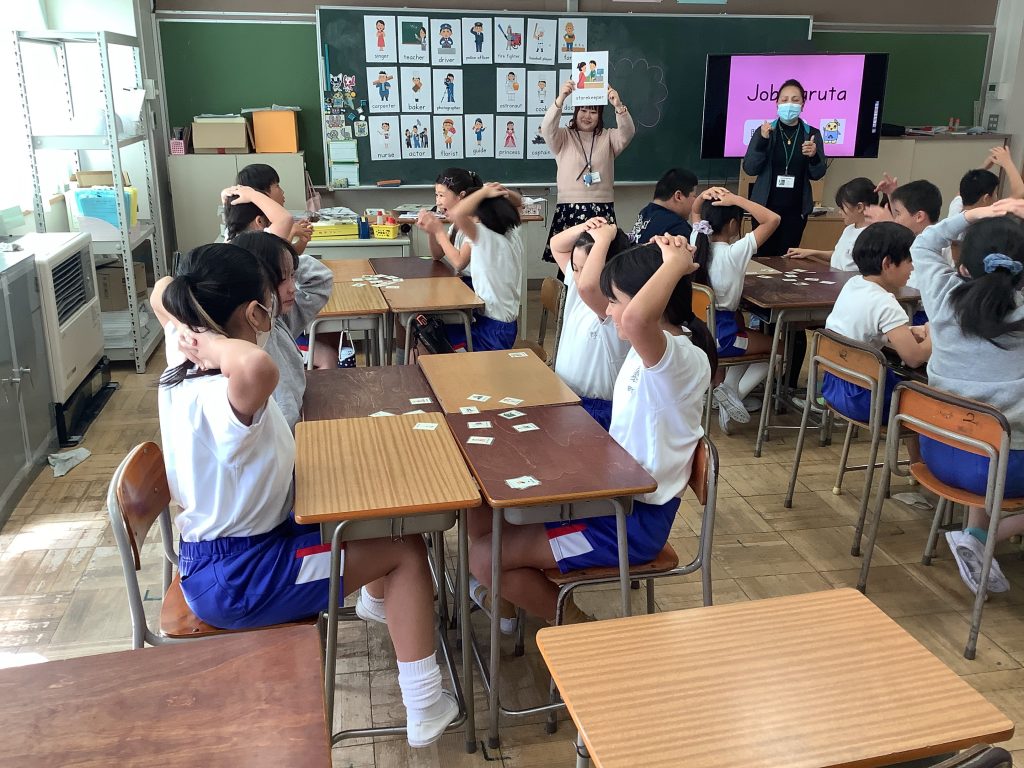 5年生、外国語の授業の様子です。さまざまな人の職業を知ることをねらいに、「Job karuta(ジョブ カルタ)」に取り組んでいます。子供たちに理解を促すため、英語専科が考えたものです。2人 対 2人の対抗戦で行います。