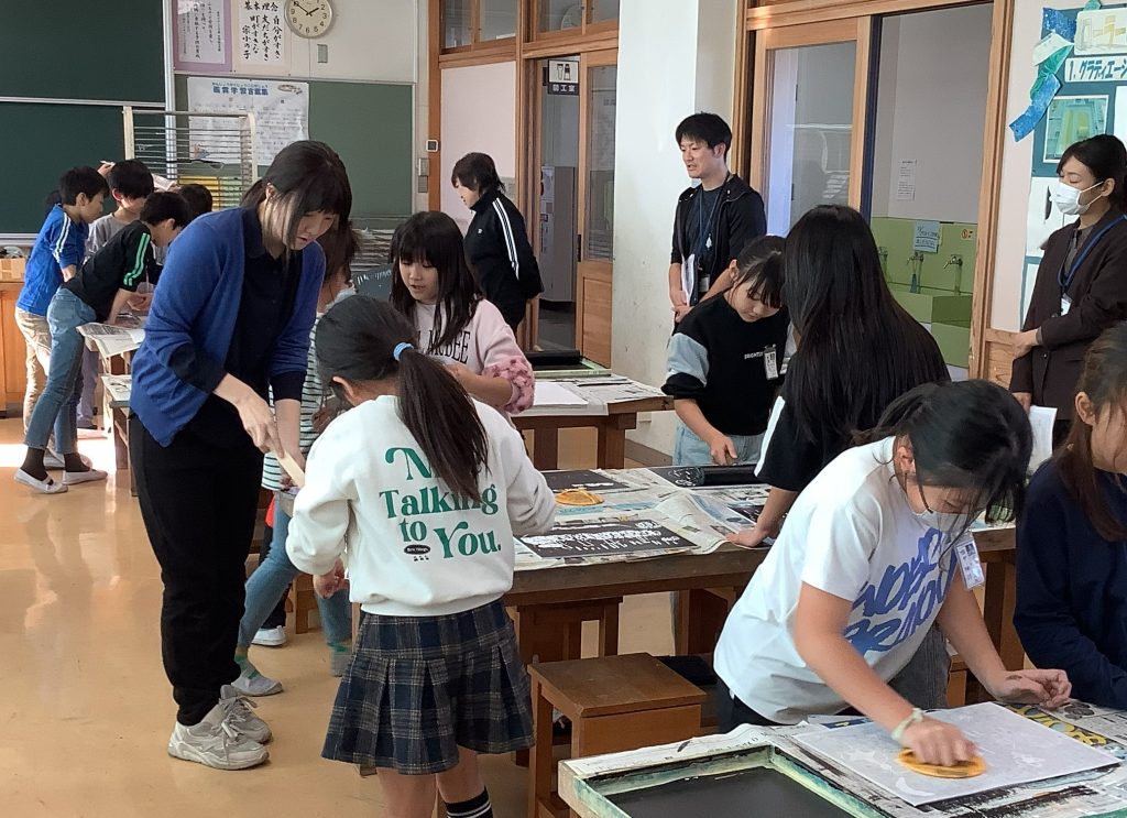 また、本時は宗岡第三小学校及び宗岡第二中学校の教員が小中一貫教育の研修のために授業を参観し、版画の学習における9年間の学びの繋がりについて研究を深めました。