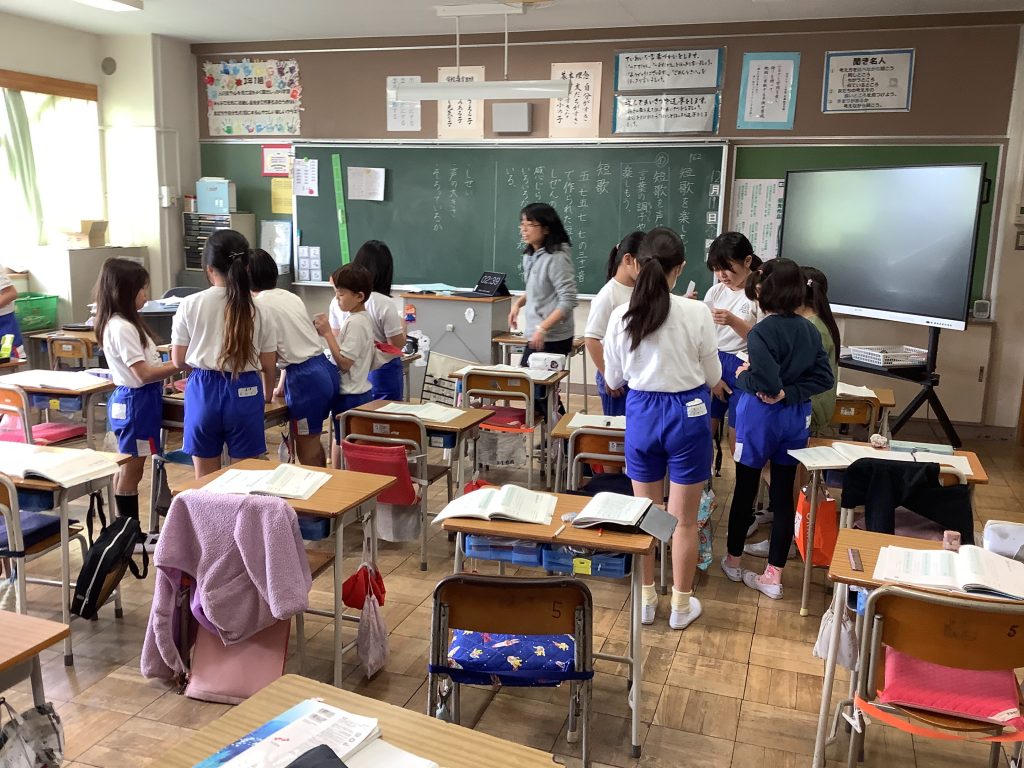 グループで練習後、みんなの前で発表しました。それぞれのグループが短歌のもつ独特な言葉の調子や響きを楽しみながら、元気よく読むことができました。