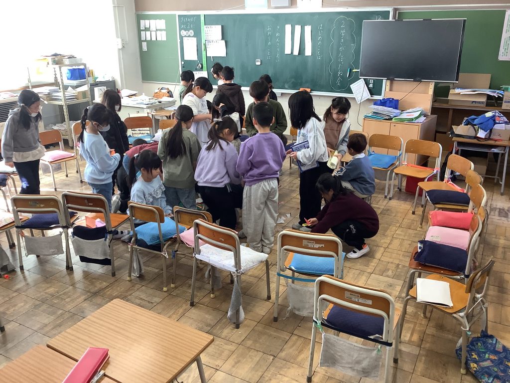 学期末のこの日のため、学級活動の授業で話し合ったことをもとに、子供たちが計画・準備をし、今日の日を迎えました。写真は、たからさがしをしている様子です。この活動の前にほとんどの子は、廊下で待っていました。教室内では、お宝が隠されていました。待っている子たちの表情は、とてもわくわくしているようでした。