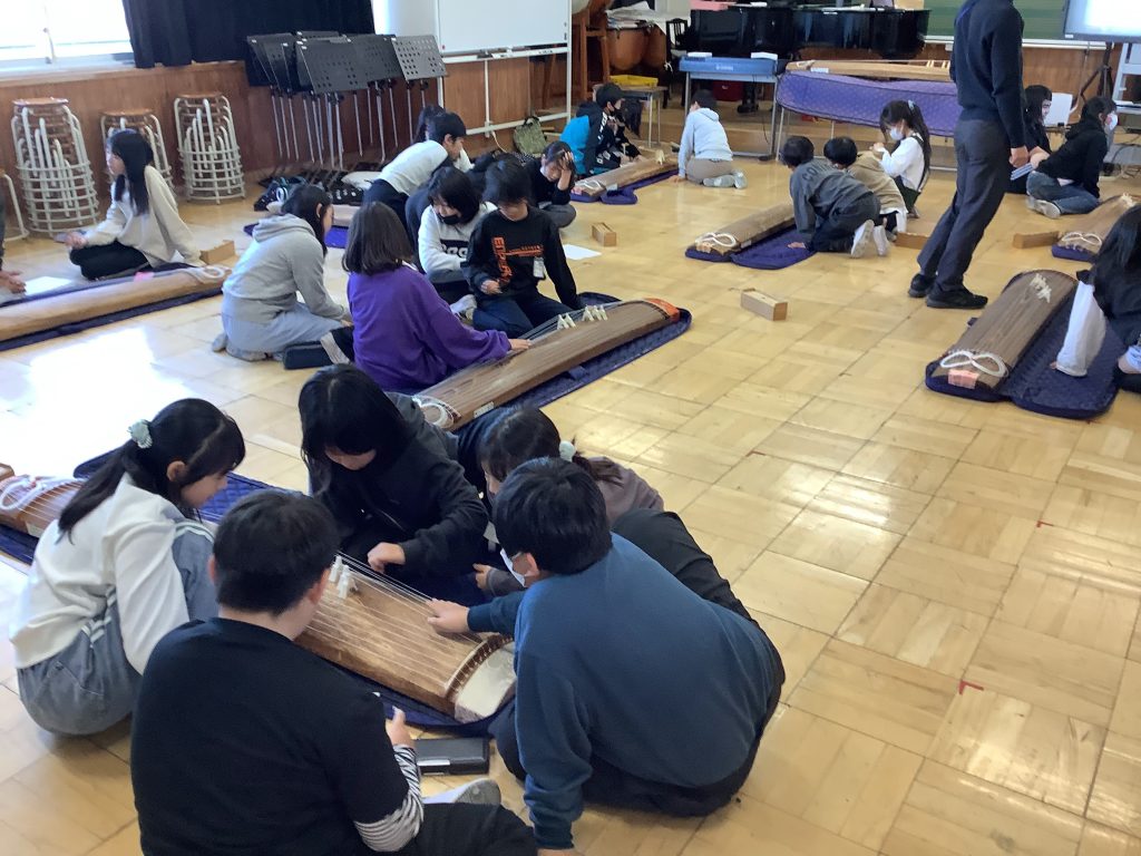 5年生、音楽の授業の様子です。「日本の音楽に親しもう」という単元で、「こと」に取り組んでいます。「こと」は日本古来の楽器で、なかなか触れる機会が少ないものです。一人一台を準備することは難しいのですが、グループの友達と交代交代で仲良く、『さくら』を演奏していました。