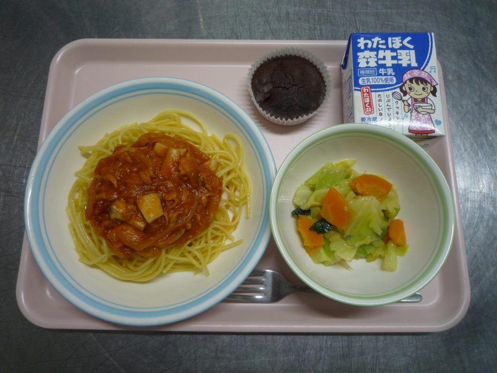 スパゲティ・コン・トンノ、キャベツサラダ、もちもちやきチョコ、ぎゅうにゅう