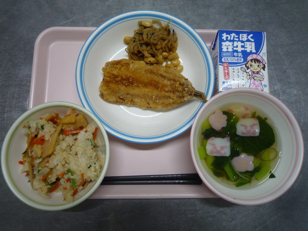 せりごはん・いわしのばいにくあげ・きりぼしだいこんとおまめのにもの・すましじる・ぎゅうにゅう