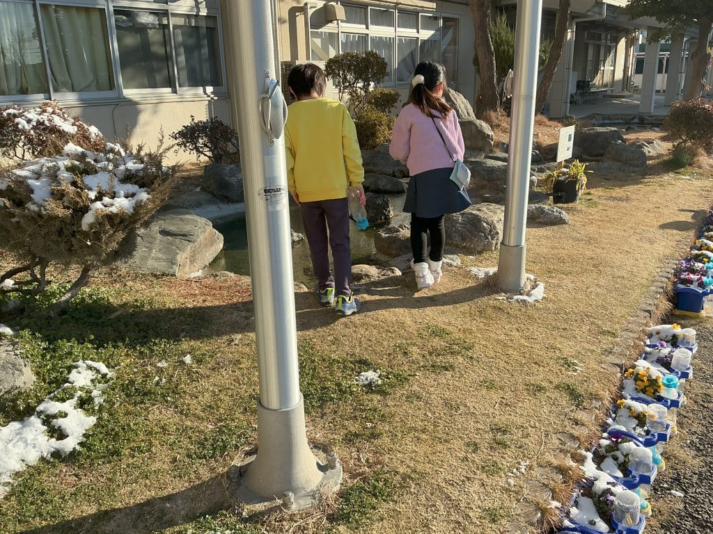 授業開始前、「宗小の池」近くの様子です。この週末は大変寒く、日曜日には雪が降りました。今朝は冷え込みが強く、池に氷がはりました。また、所々に昨日の雪が残り、1年生のビオラと球根が植えられている一人一鉢にも雪が積もっていました。