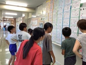 職員室前掲示板の様子です。1学期に実施した新体力テストの記録表を掲示しました。新体力テストには、8つの種目があります。男女別6学年分の上位3名ずつの記録をまとめたものです。 自分や友達、知っている子の名前を見つけ、一喜一 […]