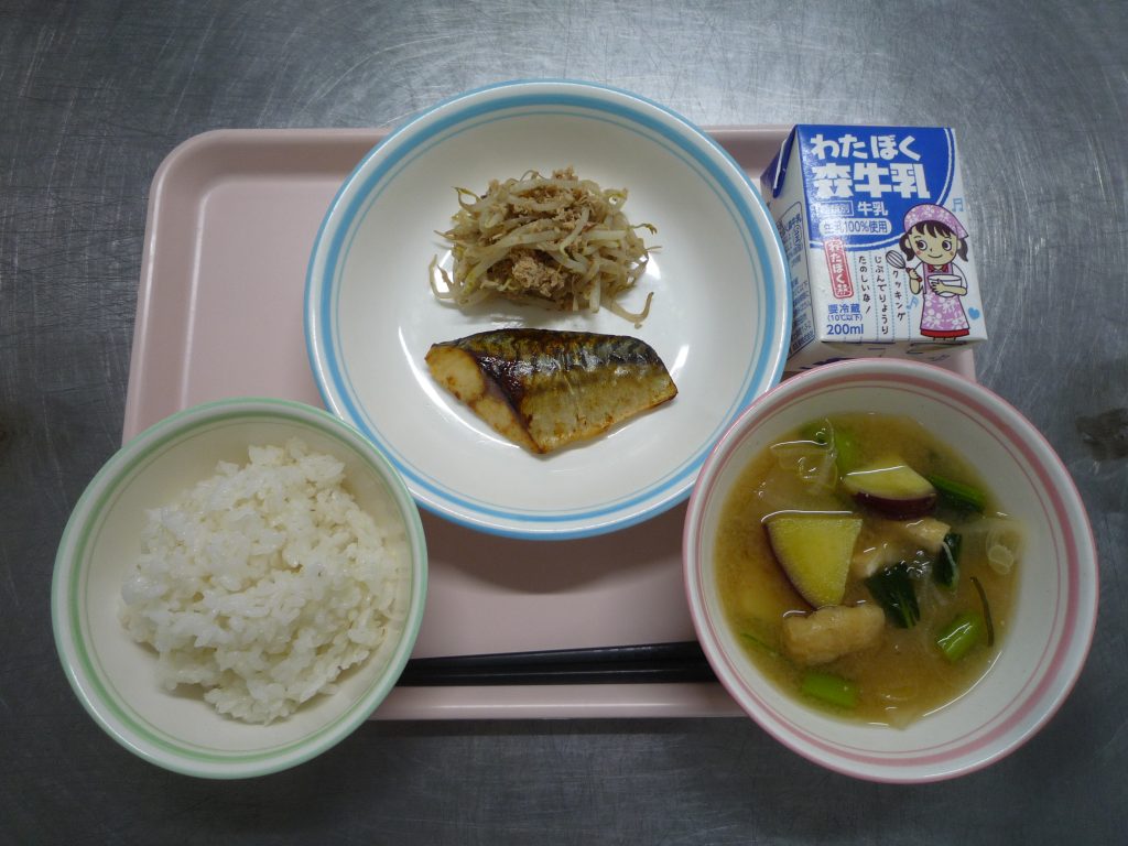 むぎごはん・さばのぶんかぼし・むげんもやし・さつまいものみそしる・ぎゅうにゅう