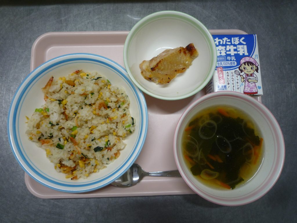 はるいろチャーハン・とりにくのしおこうじやき・わかめスープ・ぎゅうにゅう