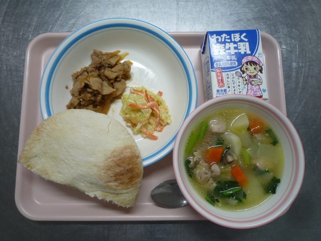 今日は、自分たちでピタパンに焼き肉とサラダを入れて食べる、『セルフピタパンサンド』です。楽しみにしていた児童も多いようで、数日前から「金曜日ピタパンだよね!」と声をかけてくれました。焼き肉とサラダに味をしっかりつけ、パンにはさんでおいしく食べられるように仕上げました。ポトフにも具材をたくさん使ったので、色々なうまみが感じられると思います。