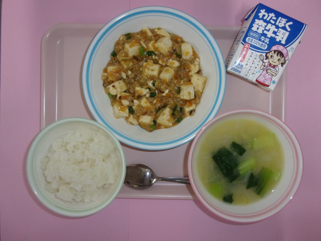 今日の給食は、ご飯・麻婆豆腐・中華風コーンスープ・牛乳です。