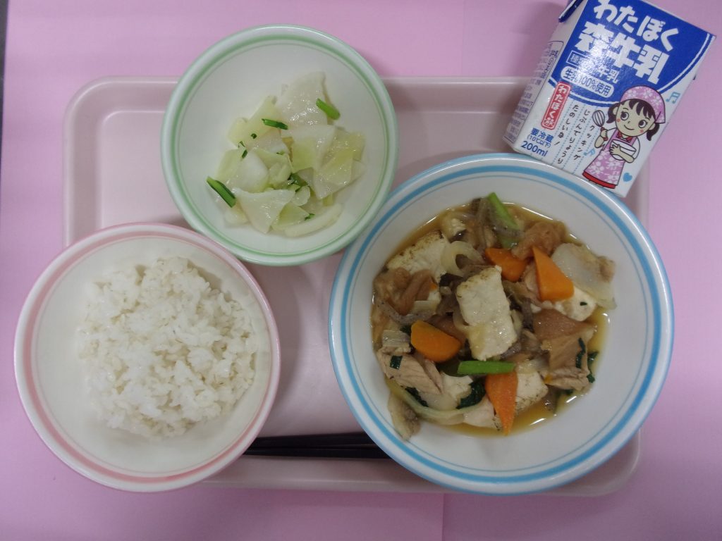 今日の給食は、麦ご飯・肉豆腐・スタミナ漬け・牛乳です。