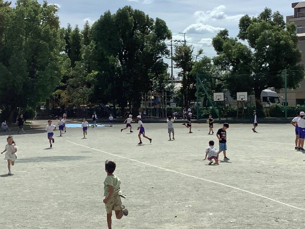 中・高学年の子は、ドッジボールなどのボールを使った遊びやグラウンドの外側を走っている姿が見られました。低学年の子は、県道側にある遊具で遊んでいる子が多くいました。