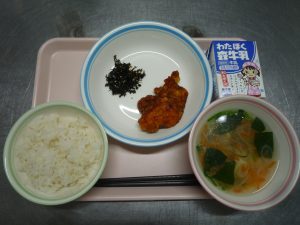 【今日の献立】 むぎごはん・キムムッチ・ヤンニョムチキン・サムゲタンふうスープ・ぎゅうにゅう 【ひとこと】 今日は韓国料理献立です。キムムッチはふりかけのようなもので、ご飯にかけて食べます。ピリ辛の海苔ふりかけで、とて […]