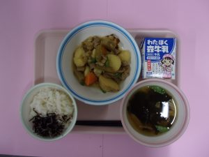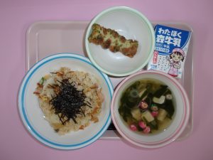 【今日の献立】 今日の給食は、麦ご飯と春のふりかけ・新じゃがとふきの煮物・若竹汁・牛乳です。 【ひとこと】 今日の給食も春を感じられるメニューです。新じゃがやふき、たけのこなど旬の食べ物がたくさん入っていることにより、五 […]