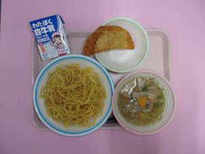 【今日の献立】 今日の給食は、中華麺・タンメンの汁・ジャンボ餃子です。 【ひとこと】 今日のジャンボ餃子は、調理員さんが1つ1つ丁寧に包んでくれています。カリっと仕上がっています。タンメンの汁には、玉ねぎ・人参・キャベツ […]