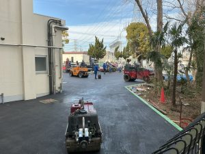 1月末に仮囲いが撤去されたことをお伝えしました。プール解体後の場所は、駐車場が増設されます。準備が少しずつ進められ、本日アスファルト舗装がされました。 少しずつ、新しい学校の姿が見えてきています。
