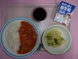 【今日の献立】 今日の給食は、麦ご飯とハッシュドポーク・グリーンサラダ・ナタデココ入りぶどうゼリー・牛乳です。 【ひとこと】 今日のぶどうゼリーには、ナタデココが入っています。ココナッツの水分を発酵させ、固まったとこ […]