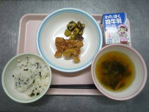 【今日の献立】 わかめごはん・とりのからあげ・さつまいもくろごまコロコロ・ちゅうかスープ・ぎゅうにゅう 【ひとこと】 今日は、6年1組1班が、家庭科の授業で考えた献立です。アピールポイントは、「みんなが大好きなからあげ […]